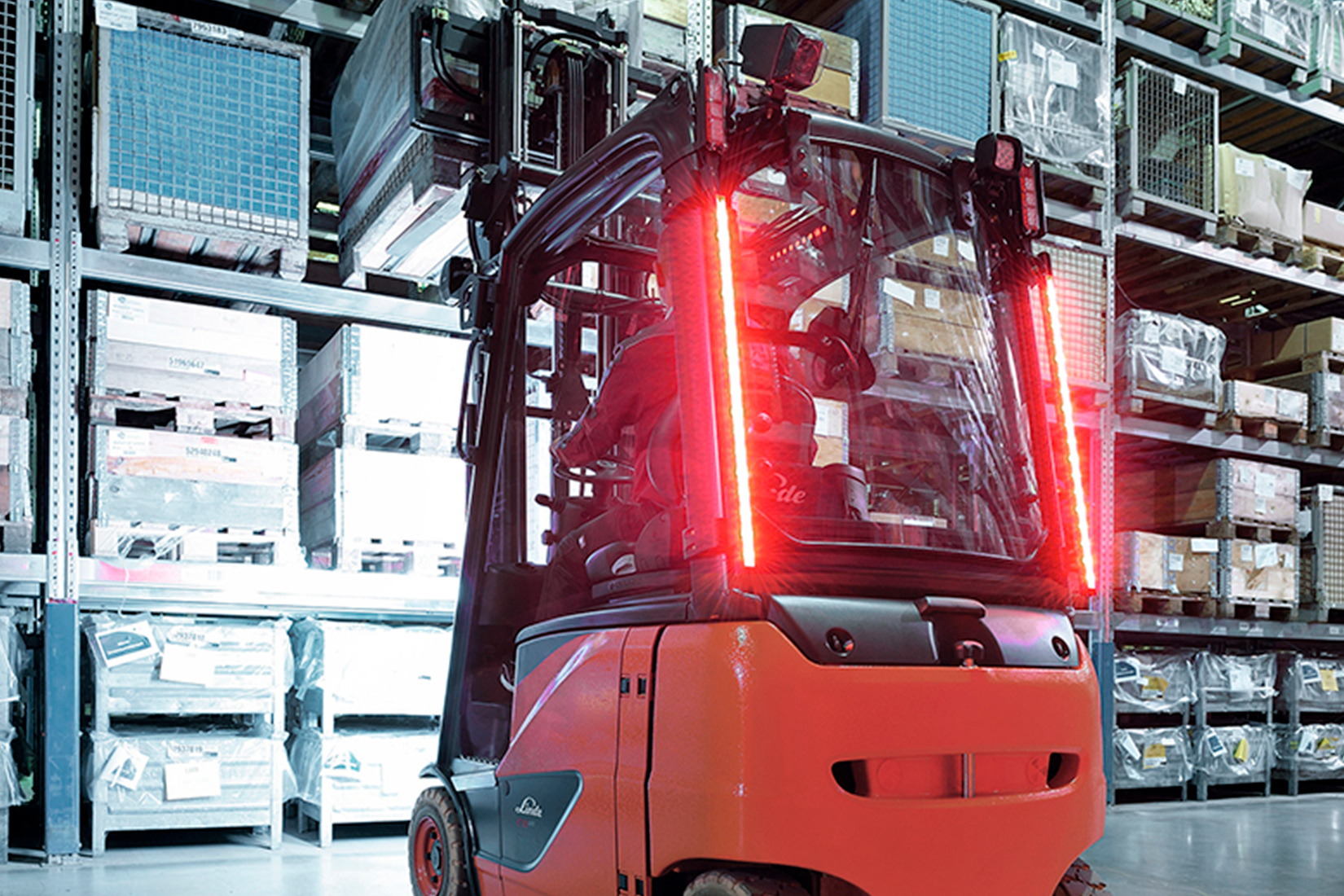 Linde LED Stripes makes it possible to fit visible LED light stripes to the forklift cabin. They emit a pronounced, white light in the forward direction and a pronounced, red light to the rear.