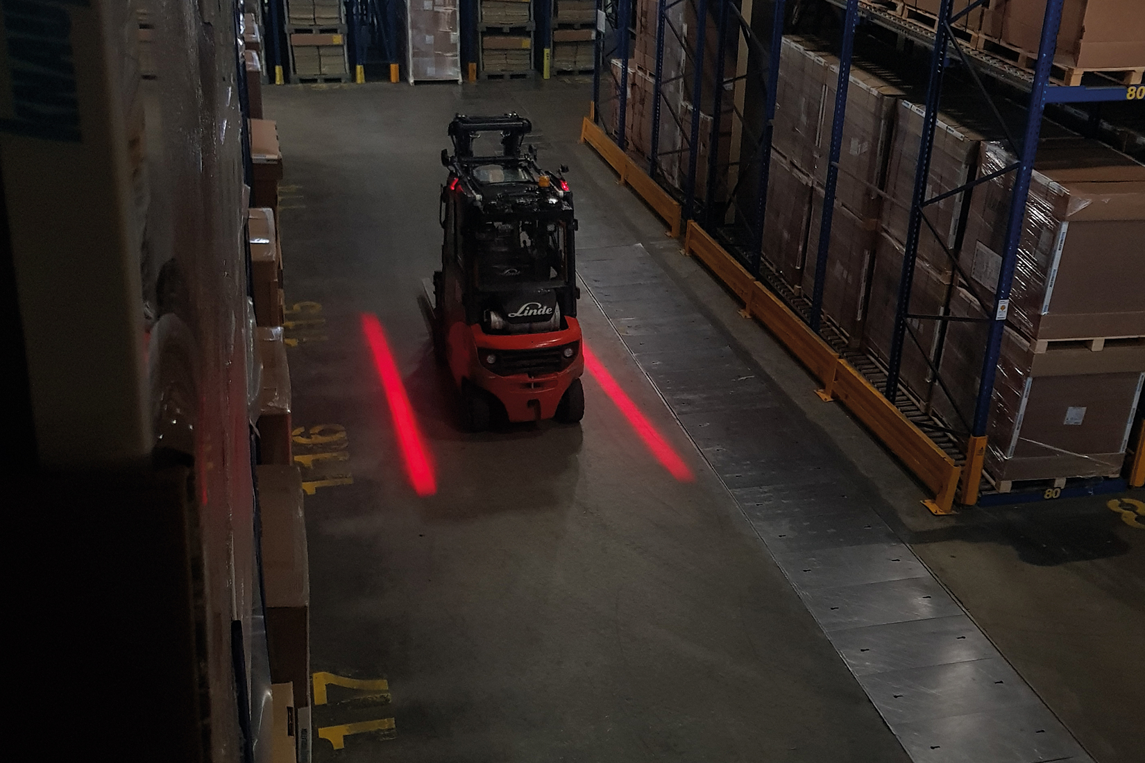 De fleste uheld hvor gaffeltruck er involveret sker i umiddelbar nærhed af maskinen. Ved hjælp af LED-lys projekterer Linde Warning Lines tydelige advarselslinjer på siden af – og bag på – maskinen, og kan leveres med rødt eller blåt lys.